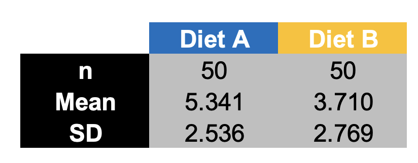 - Measured on the Mean and Standard Diviation, the data implies that Diet B is less effective.