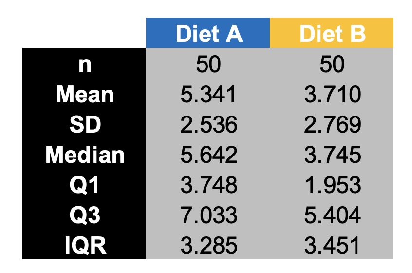 - Dieat A has a Q1 of 3.7 while Diet B has a Mean of 3.7. This means 75% of paticipians from Diet A scored higher than the average person from Diet B.