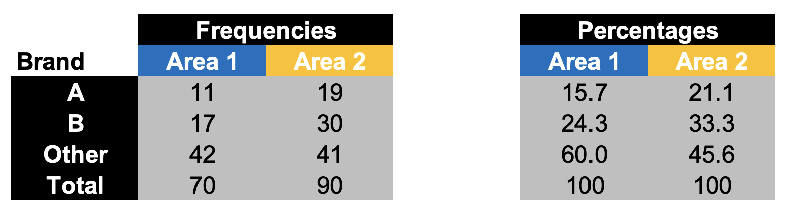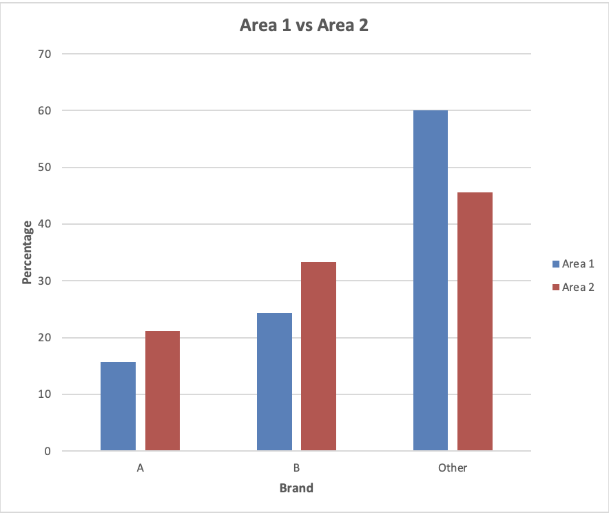 - In Area 2, both A and B gain a larger share (just over half of all preferences combined), suggesting a more competitive brand environment where the manufacturer’s brands are more actively chosen and the “Other” category is less overwhelming than in Area 1.