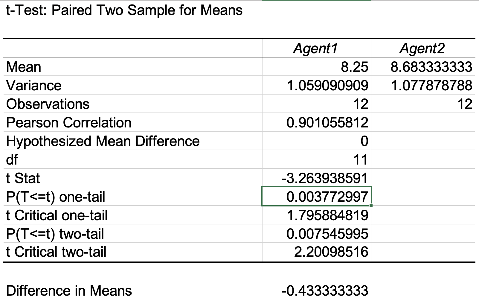 - The analysis shows a mean difference of -0.43 units between the two agents. The probability of observing such a difference (or larger) by random chance is approximately 0.8% ($p = 0.0075$).