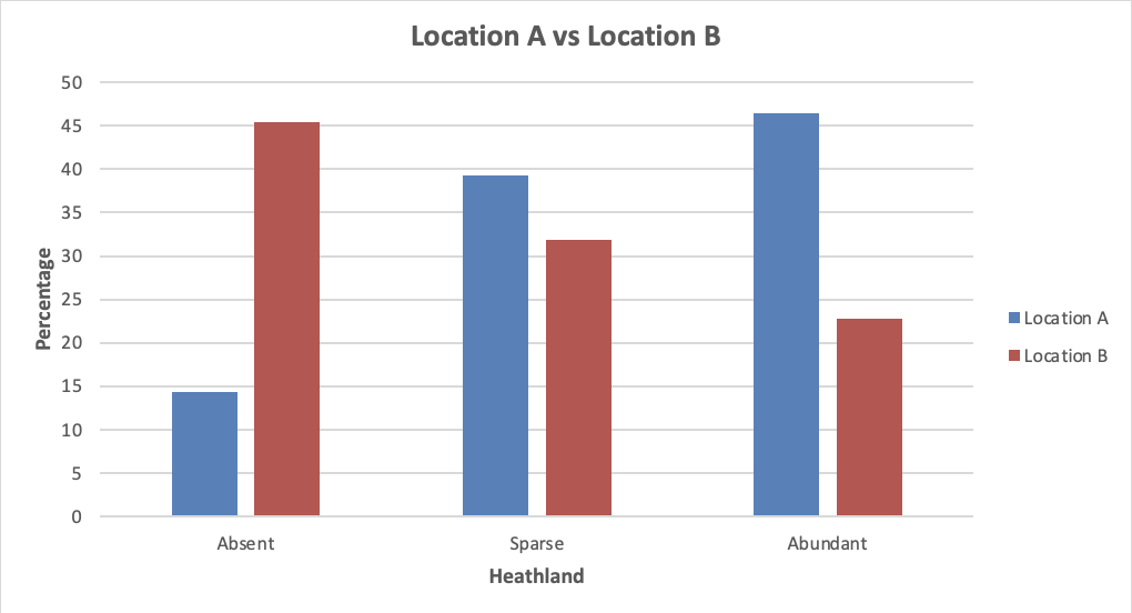 - Overall, the distribution shifts from “mostly abundant” in Location A to “mostly absent or sparse” in Location B, showing a clear ecological contrast between the two heathlands.