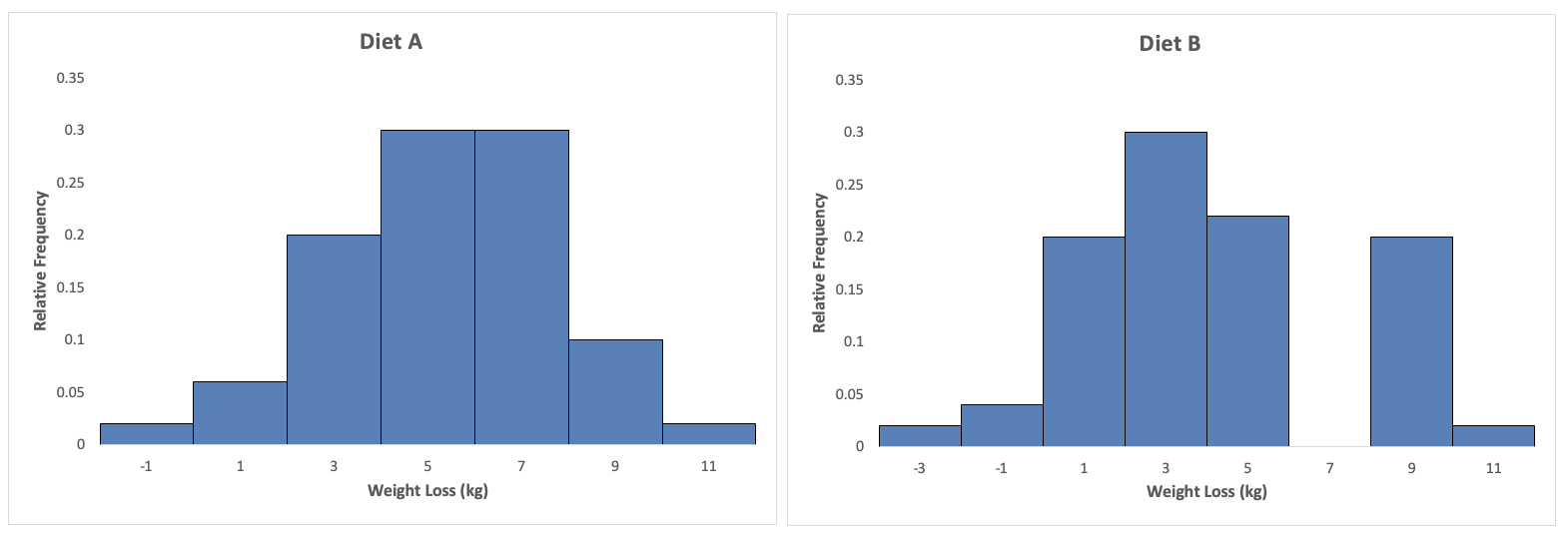 - Overall, the histograms suggest that Diet A tends to deliver more reliably positive weight loss, whereas Diet B appears less predictable, with both poorer and very strong individual results.